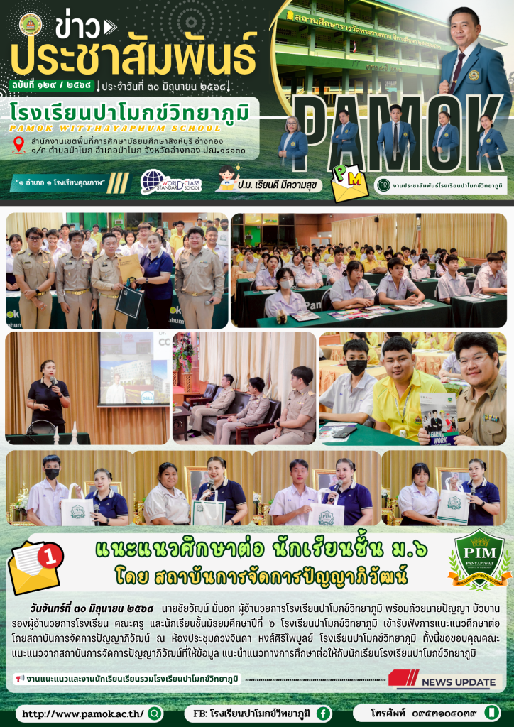 วันจันทร์ที่ ๓๐ มิถุนายน ๒๕๖๘ นายชัยวัฒน์ มั่นอก ผู้อำนวยการโรงเรียนปาโมกข์วิทยาภูมิ พร้อมด้วยนายปัญญา บัวบาน รองผู้อำนวยการโรงเรียน คณะครู และนักเรียนชั้นมัธยมศึกษาปีที่ ๖ โรงเรียนปาโมกข์วิทยาภูมิ เข้ารับฟังการแนะแนวศึกษาต่อ โดยสถาบันการจัดการปัญญาภิวัฒน์ ณ ห้องประชุมดวงจินดา หงส์ศิิริไพบูลย์ โรงเรียนปาโมกข์วิทยาภูมิ ทั้งนี้ขอขอบคุณคณะแนะแนวจากสถาบันการจัดการปัญญาภิวัฒน์ที่ให้ข้อมูล แนะนำแนวทางการศึกษาต่อให้กับนักเรียนโรงเรียนปาโมกข์วิทยาภูมิ