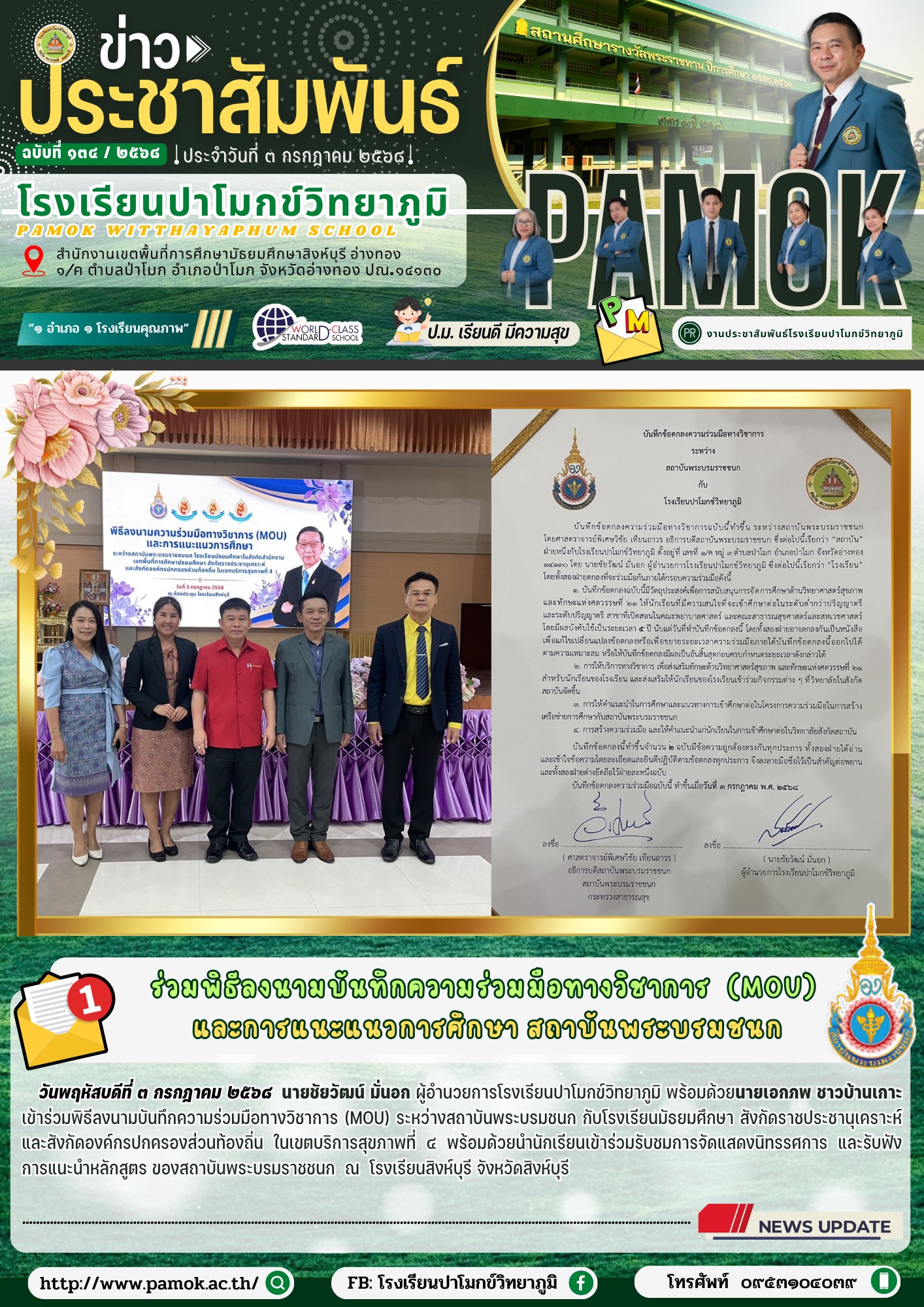 ร่วมพิธีลงนามบันทึกความร่วมมือทางวิชาการ (MOU) ระหว่างสถาบันพระบรมชนก กับโรงเรียนมัธยมศึกษา